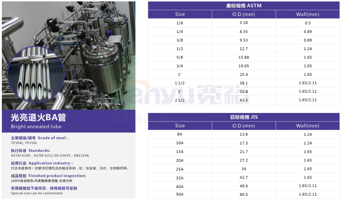 应用领域:半岛.体育光亮退火BA管, 医疗脱脂半岛.体育管,半岛.体育BA级管,半岛.体育洁净级管,符合美标规格ASTM、日标规格JIS。