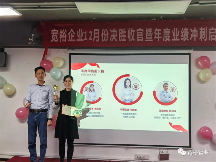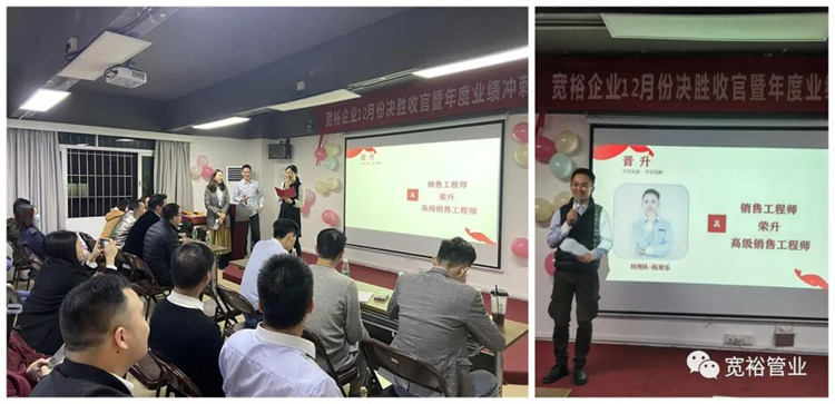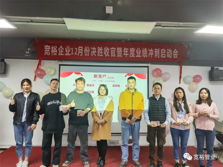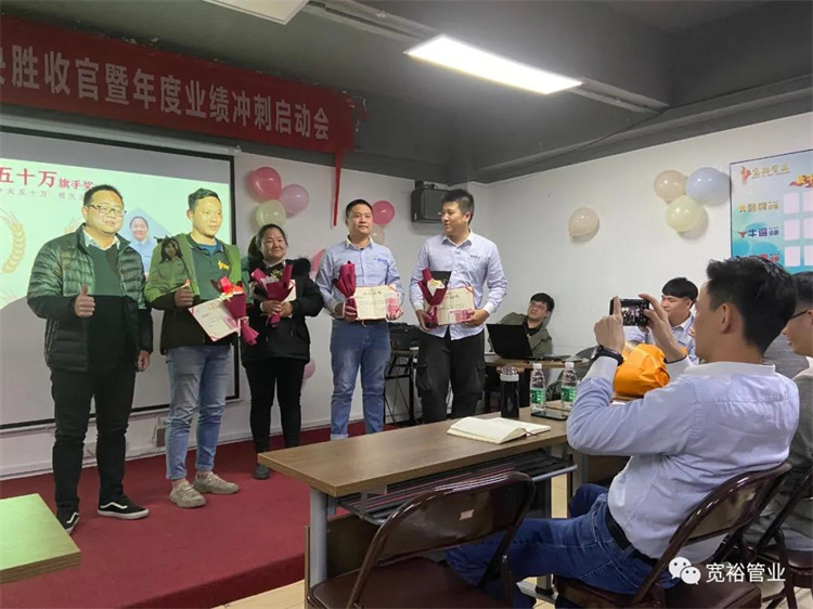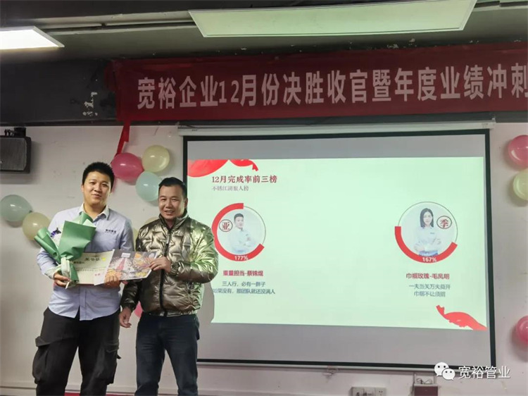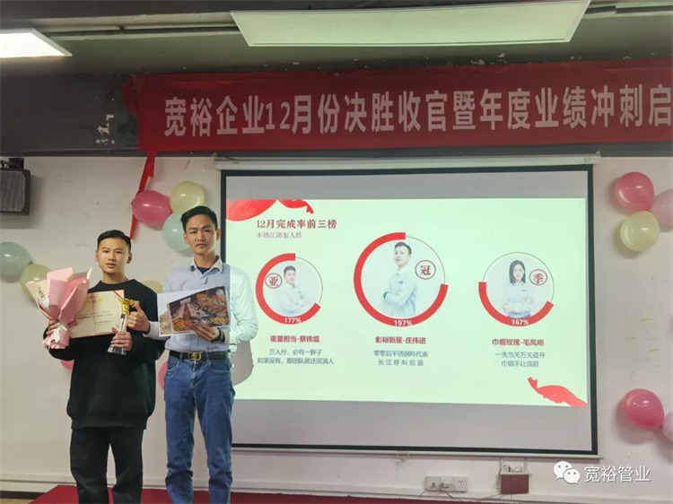 1月6日晚上,宽裕企业“快乐挣口粮,幸福过肥年”之12月收官之战总结及颁奖典礼在企业总部三楼会议室隆重举行!经过了一个月的奋战,经过一次启动及二次启动的叠加推进,每天早开会、晚总结,一个一个看似微不足道的动作,全都为了指向最终目标的胜利实现!宽裕的全体战士们最终以100%完成冲刺任务的彪炳战绩为2020年画上了圆满的句号!在此,小编仅代表宽裕企业感谢所有英勇奋战的战士们!感谢台前幕后所有的伙伴们共同推动了本次收官之战的胜利!1月6日,我们胜利会师啦!