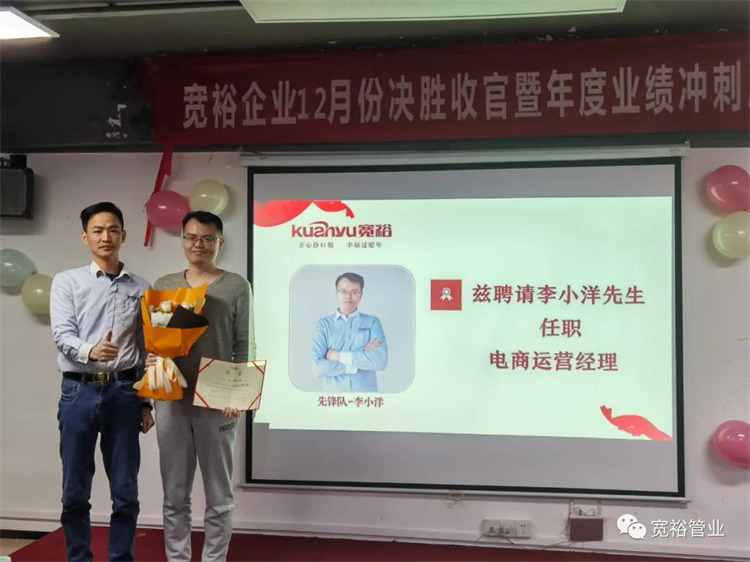如果说,企业创始人的认知边界决定着企业发展的高度,那么企业内部的人才量则决定着企业发展的广度!宽裕在组织发展的招选育用留裁一直不遗余力!内部开展各项晋升机制,以及人才引进的伯乐奖等,为的都是源源不断引进及发展培育更多优秀的人才!本次总结会上,就有来自精鹰队的“包子”-聚乐,获得了晋升!更有来自采购部的陈林主管、网络运营经理-小洋(花名鵰哥)、运营管理中心总监icy,在本次活动中完成了简单而隆重的聘用仪式。仪式感满满,让人喜出望外更倍感责任重大!